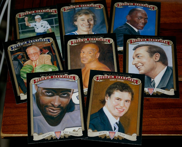 The grocery store had a few discounted blasters today, and I kinda wanted something to rip. There were no discounted baseball blasters, though. The closest they had was 2012 Goodwin Champions.. featuring a few random baseball players in suits or playing golf. How wretched, right? But I was like, screw it, let's throw caution to the wind and grab this abomination of a sportscard product.