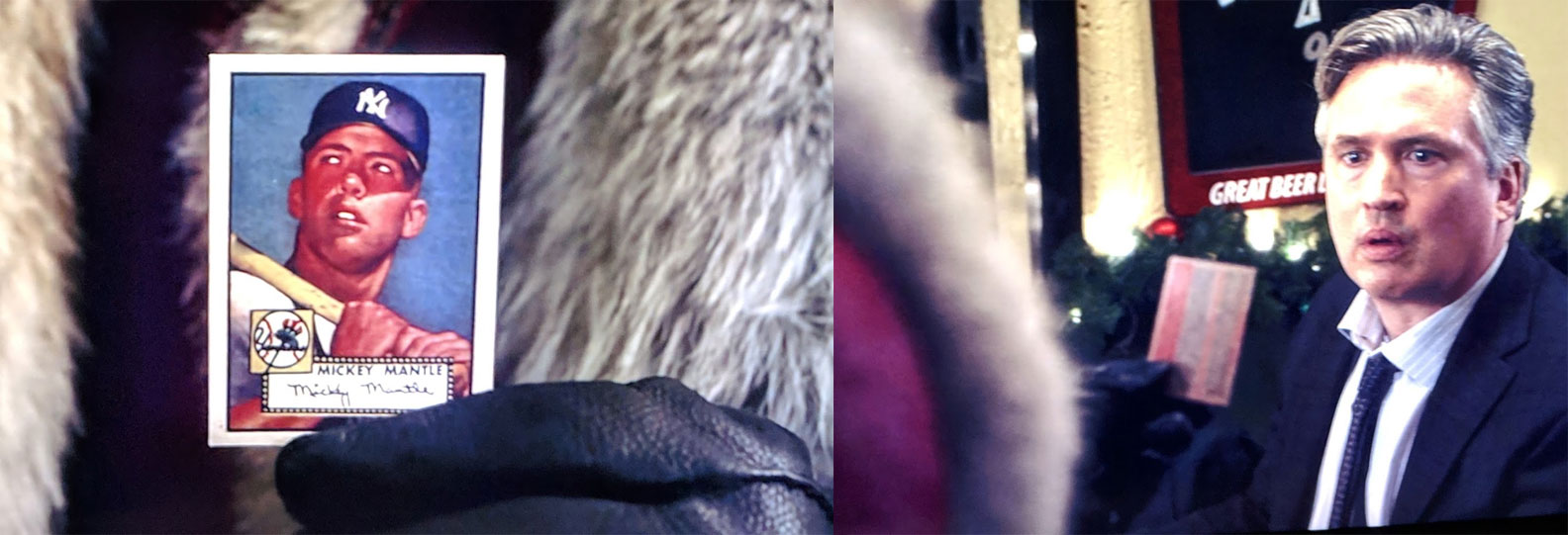 The Christmas Chronicles (2018 film) - This Netflix original holiday movie starring Kurt Russell follows a brother and sister who, after accidentally crashing Santa Claus' sleigh, must save Christmas. At one point, Santa offers a guy a mint '52 Topps Mantle in exchange for his Porsche. The guy seems totally into the deal, but his mean wife takes the card and rips it in half, believing Santa to be just a crazy guy. The card used (thankfully) seems to be an obvious reprint.